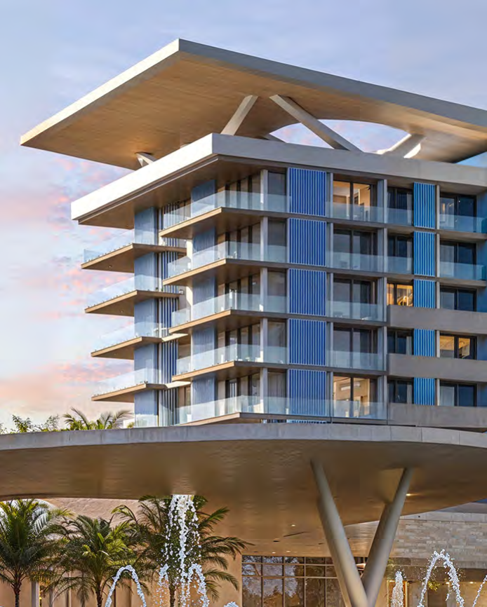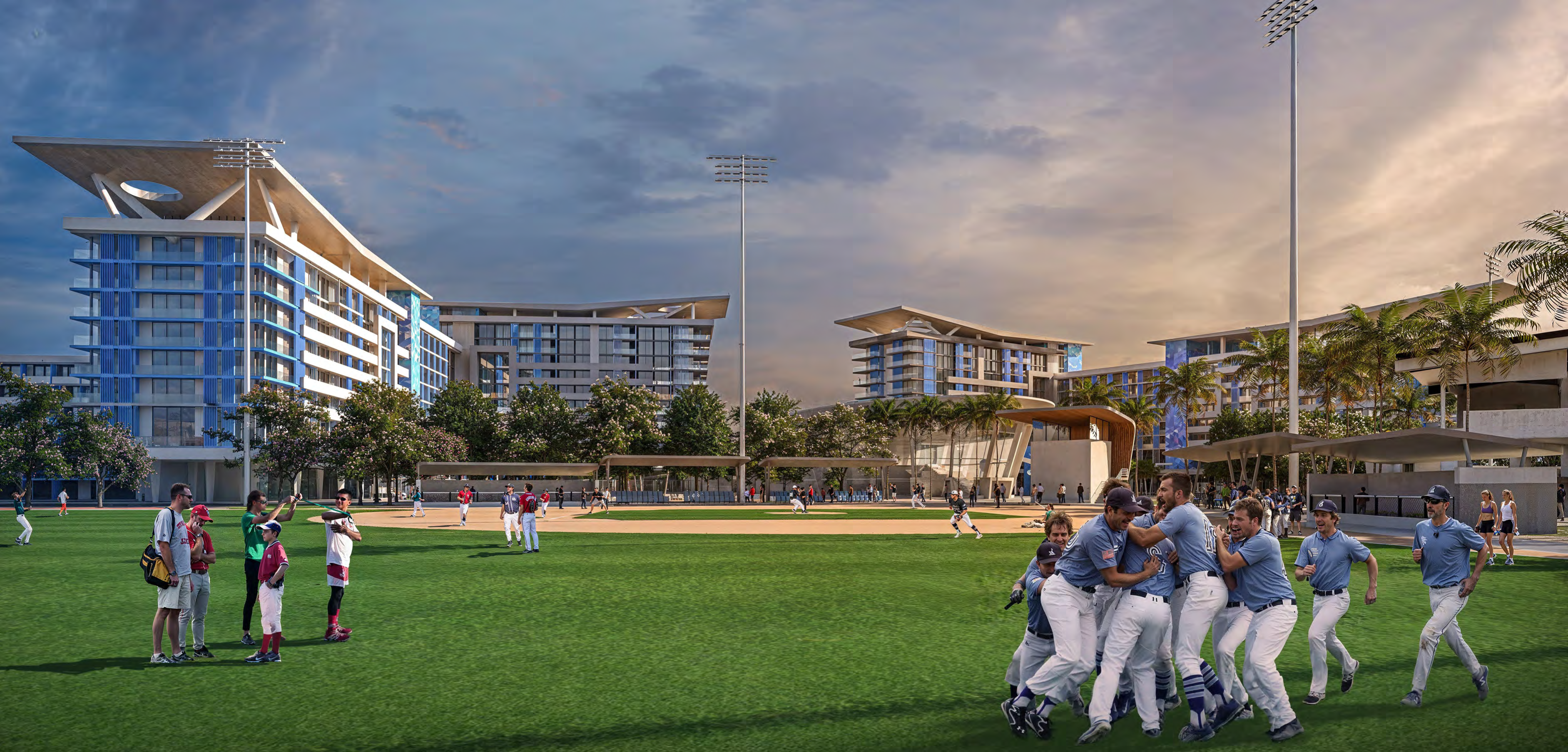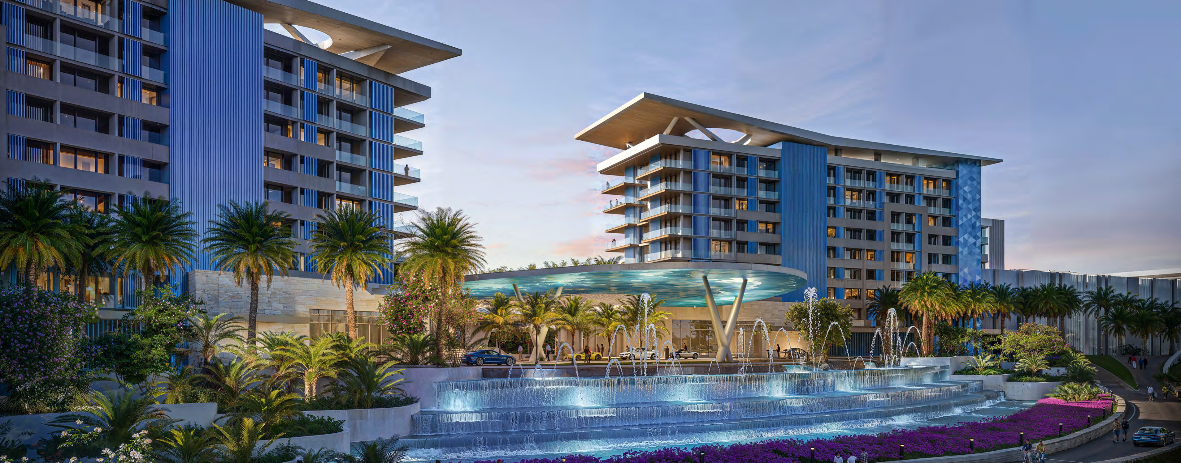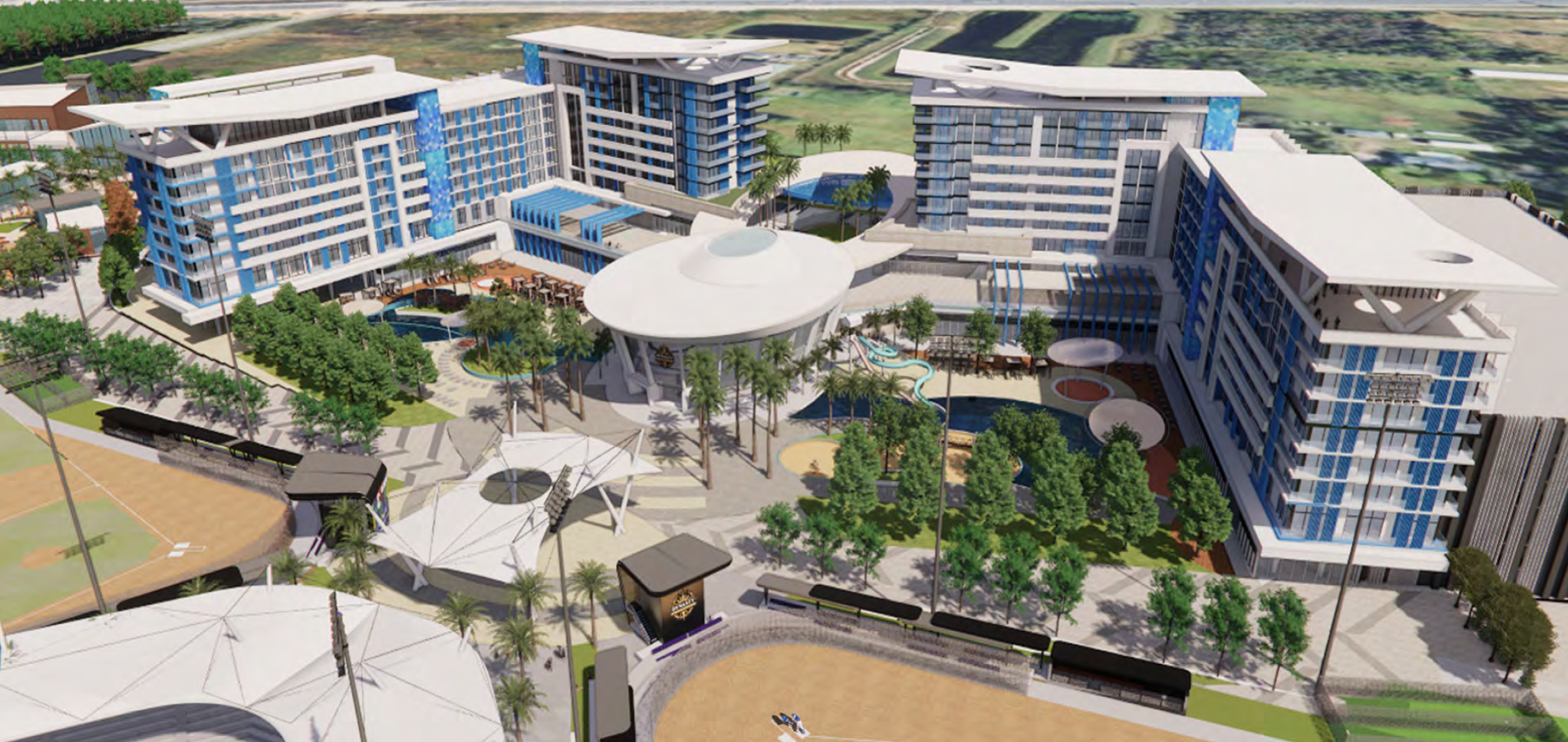 The architectural solution features a striking twin-tower design, accessible via a grand terrace canopy and centralized Welcome Center, effectively concealing parking while maximizing guest experience. Accommodation is unparalleled, with numerous suites boasting private balconies that offer direct, immersive views of the surrounding baseball fields. Amenities are thoughtfully divided across two major recreational zones: the serene West Pool Terrace, designed for adult relaxation, and the vibrant East Pool Terrace, which caters to family-friendly activity with natural landscape accents.