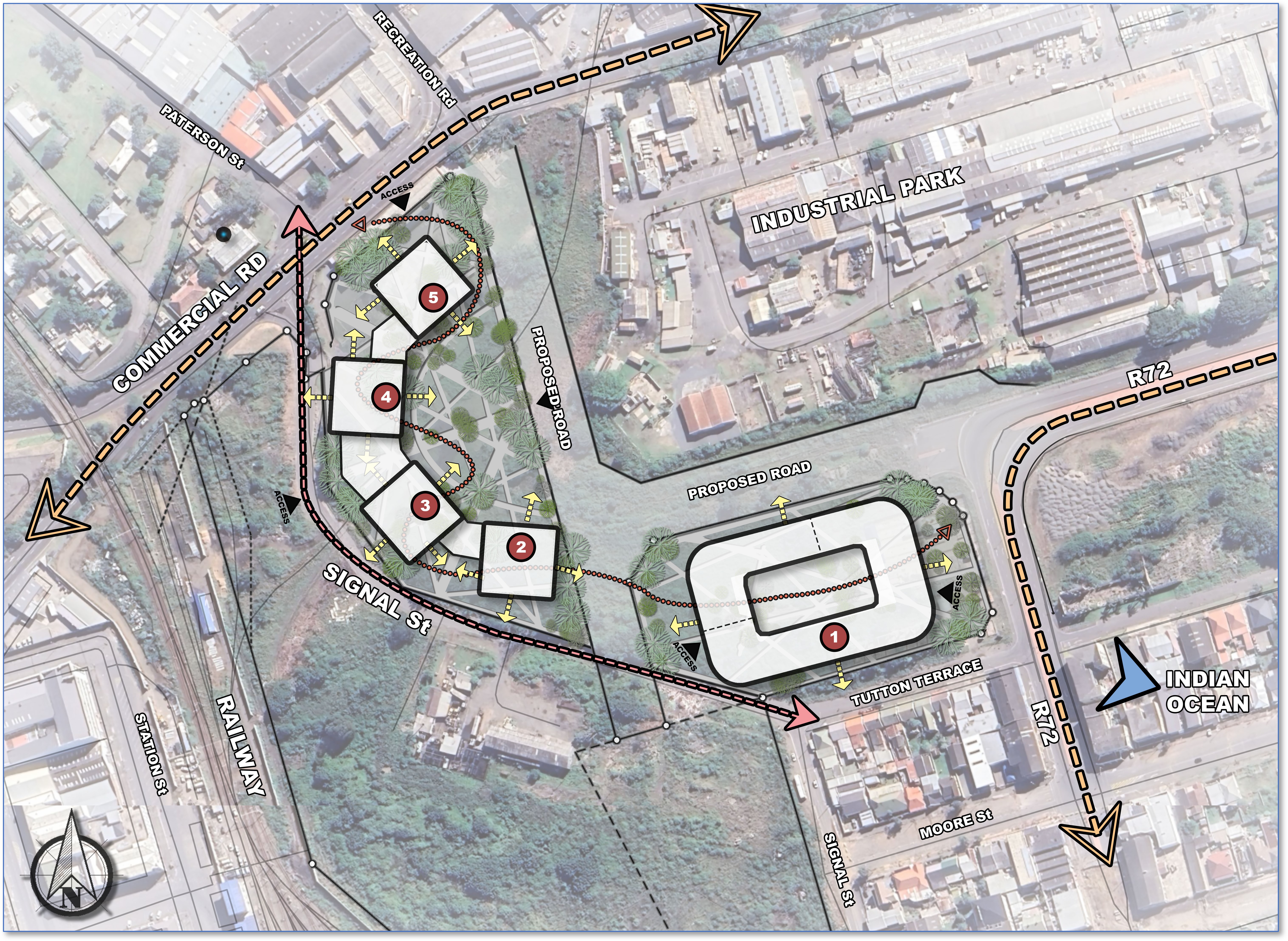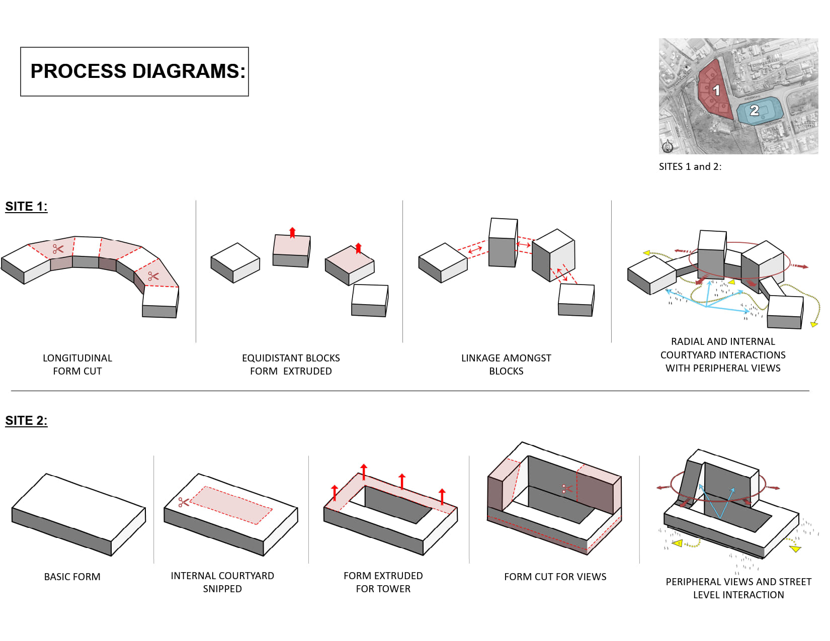 This extensive mixed-use proposal for Buffalo City centers on creating a dynamic, interconnected urban hub that seamlessly integrates commercial office space, premium hospitality, and vital public amenity areas. The core design philosophy, driven by concepts like "Radial Design," "Organic Landscape," and "Interconnected Forms," aims to maximize social interaction and capitalize on peripheral ocean views while providing sophisticated, functional buildings. The project is strategically positioned across two distinct sites, utilizing process diagrams to develop forms that respond to site context, sight lines, and street-level engagement.The resulting architecture features multiple towersâsome with sleek white concrete and black aluminum frames to capture morning sunlight, and others tailored for specific functionsâall linked by social bridges and unified by a large, central public courtyard. This courtyard acts as the projectâs social heart, merging nature with a dynamic workspace and serving as a harmonious meeting point for workers, hotel guests, and the public.
