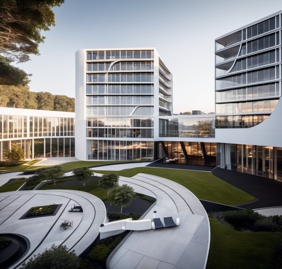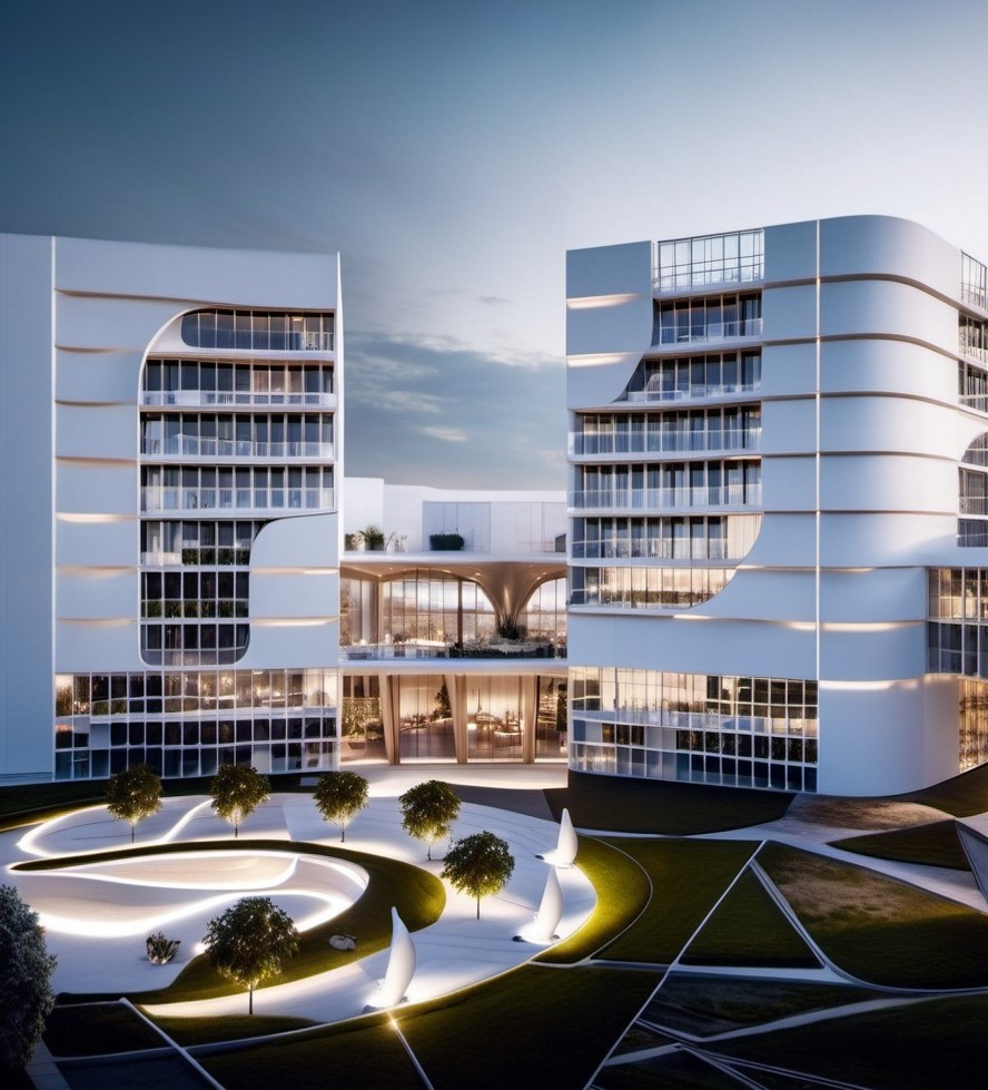 The hospitality component focuses on creating a distinctive hotel tower with ocean views, utilizing simplistic materials, glass, and aluminum facades.A key achievement of the design is the thoughtful integration of nature and productivity; the landscaped, internal courtyards and interconnected pathways ensure that all componentsâoffices, hotel, and retailâfeel part of a cohesive ecosystem. By prioritizing maximizing views, providing robust linkages between blocks, and designing vibrant, distinct towers, this development establishes a new standard for functional elegance and social integration within the Buffalo City landscape.