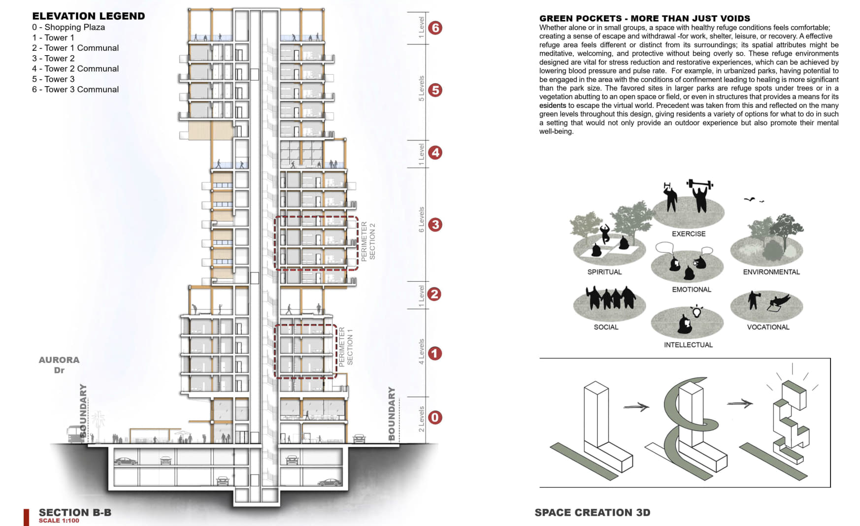 The design prioritizes adaptable, fluid, and interconnected zones that can shift between individual study, collaborative work, recreation, and restorative quiet spaces. This flexibility supports a range of learning modalities while preparing the school for future disruptions that may require rapid spatial reconfiguration.Biophilic design is used as a key strategy to counteract the psychological strain associated with confined, monotonous environments. Natural materials, abundant daylight, strategically framed outdoor views, and landscaped courtyards promote calmness, creativity, and social engagement. The integration of Mass Timber construction, as explored within the research, provides both a sustainable structural solution and a tactile, warm, human-centred interior experience.