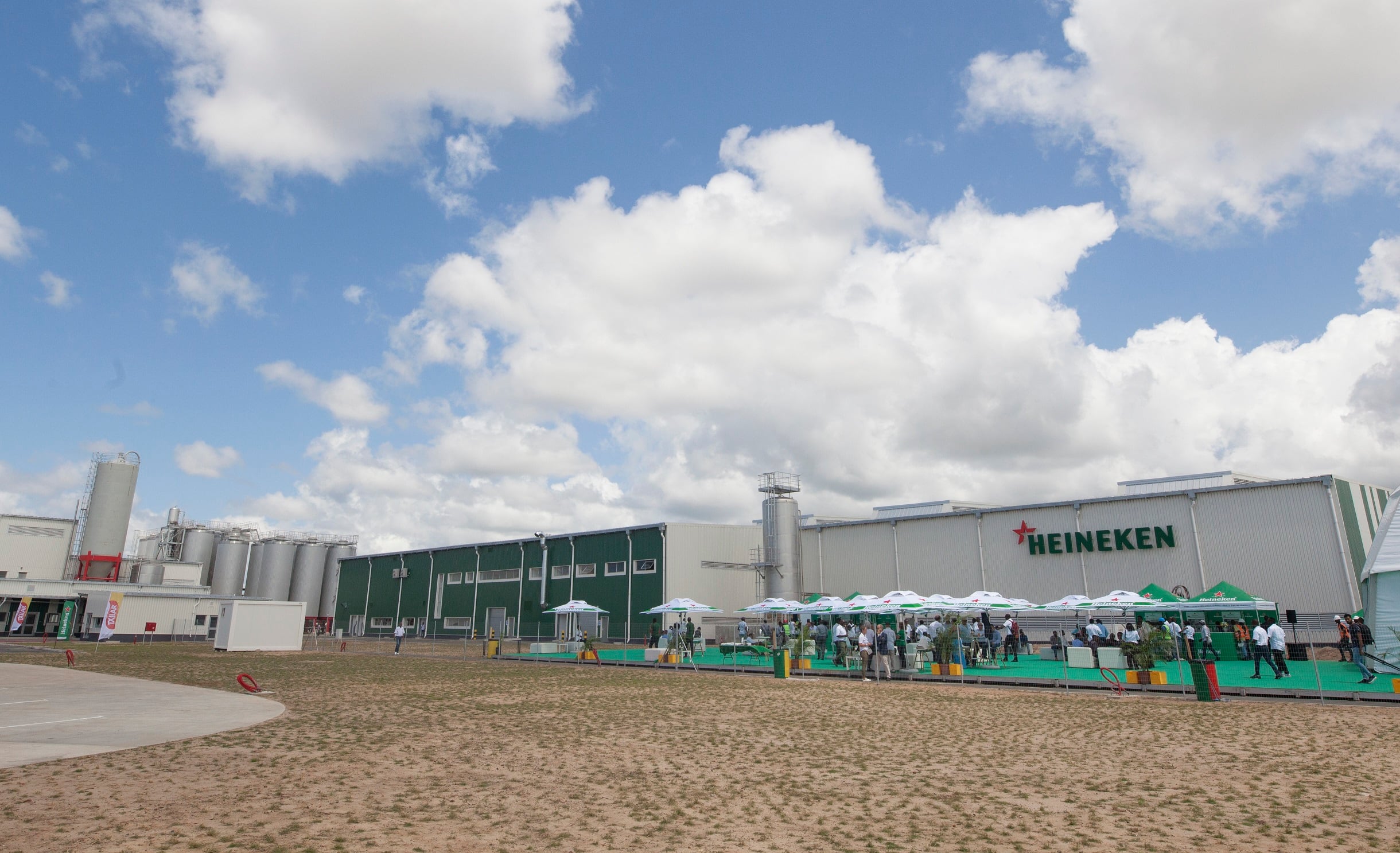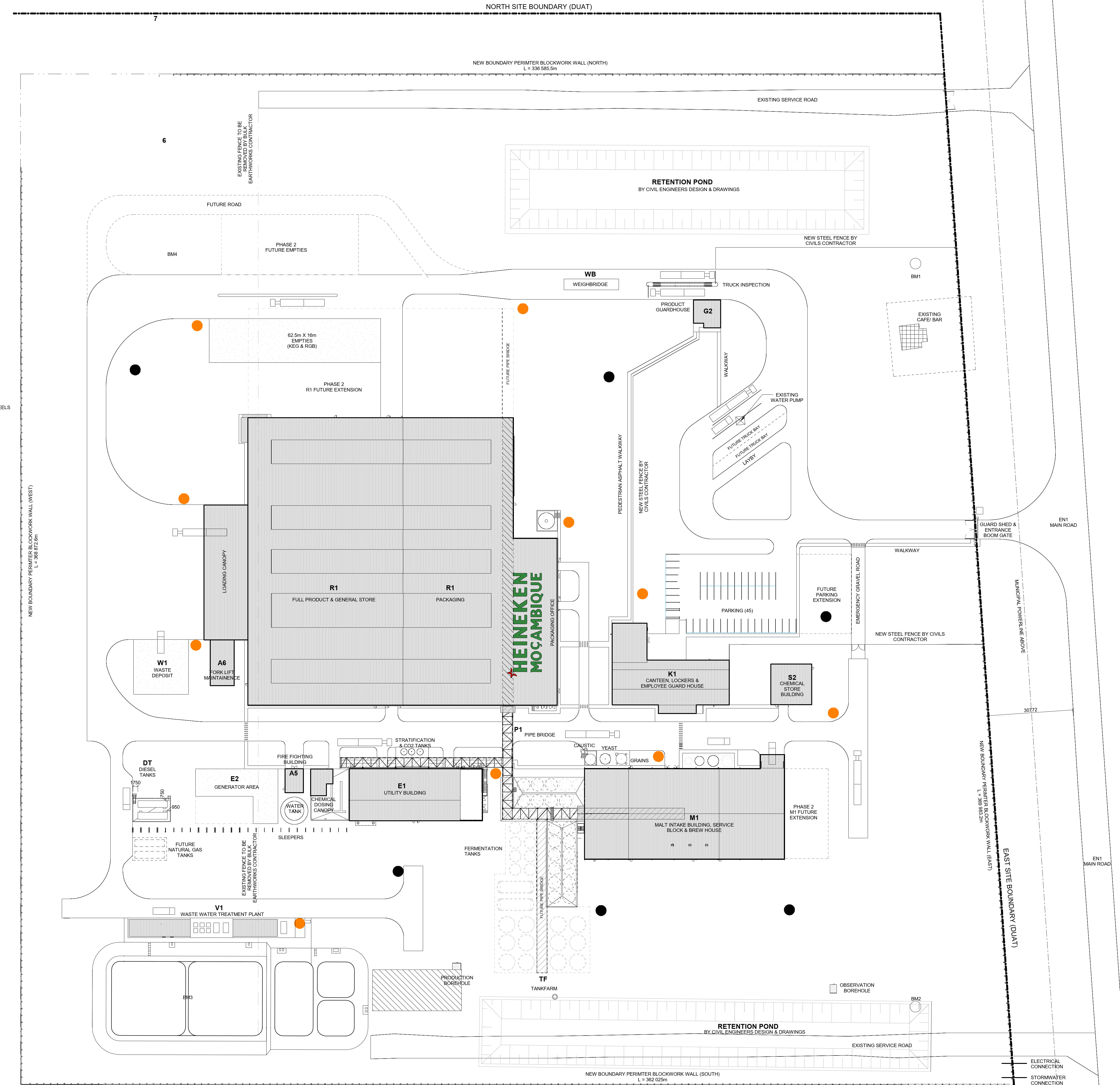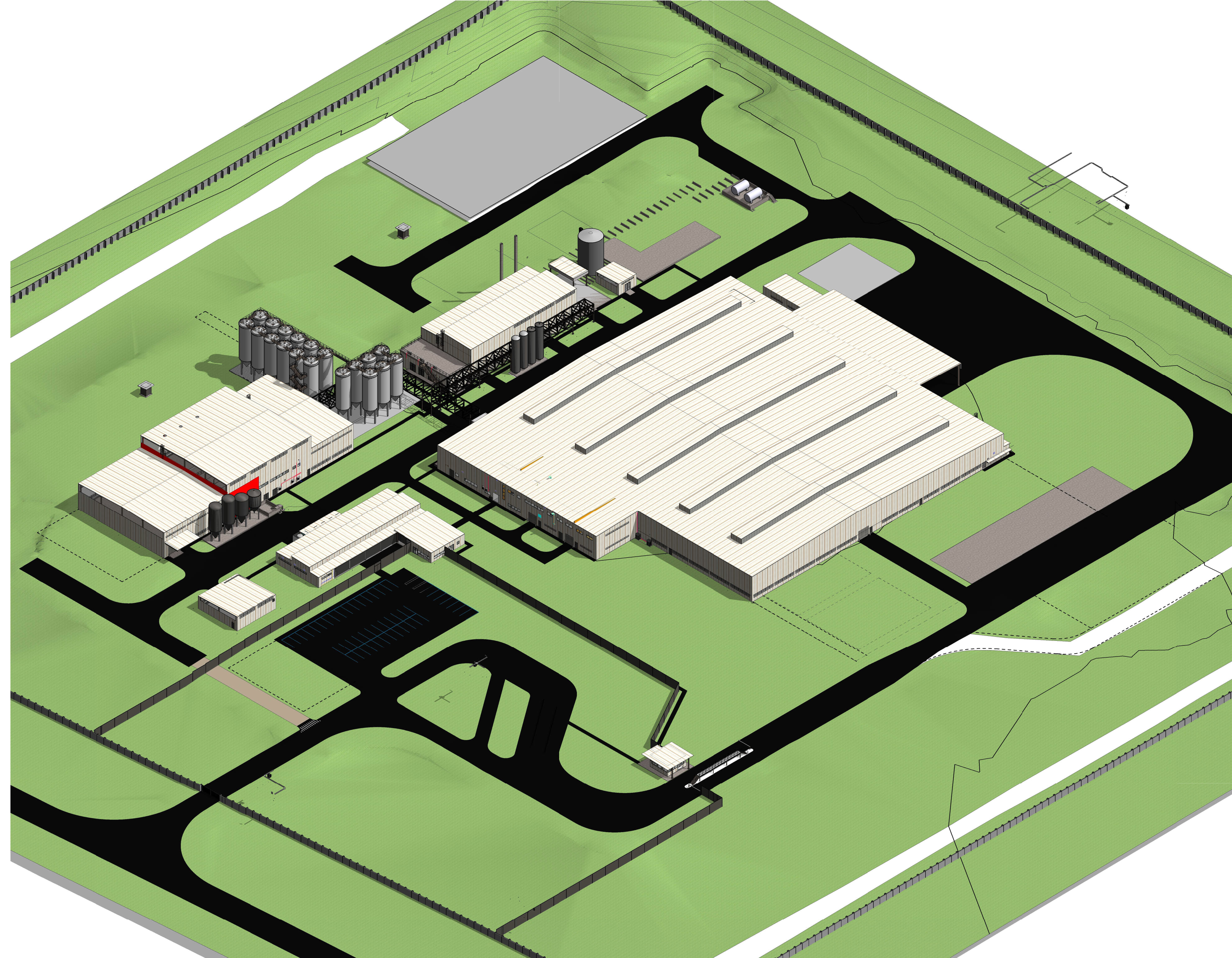 The axonometric site plan illustrates a well-organized campus emphasizing functional zoning and circulation. Wide internal roads support heavy transport movement, while pedestrian and administrative areas remain safely separated. Support buildingsāsuch as laboratories, offices, and servicesāare positioned for operational oversight and efficient access to the main production lines. Landscaping buffers and structured open spaces contribute to a clean, orderly industrial environment.The inclusion of designated outdoor gathering zones, as seen in the site photograph, allows for staff activities and events, adding a human-centered element to the industrial setting and reinforcing Heinekenās brand identity.Overall, the project achieves a strong balance between technical performance, environmental consideration, and corporate presence, resulting in a modern, scalable brewery complex that strengthens Mozambiqueās growing manufacturing sector.