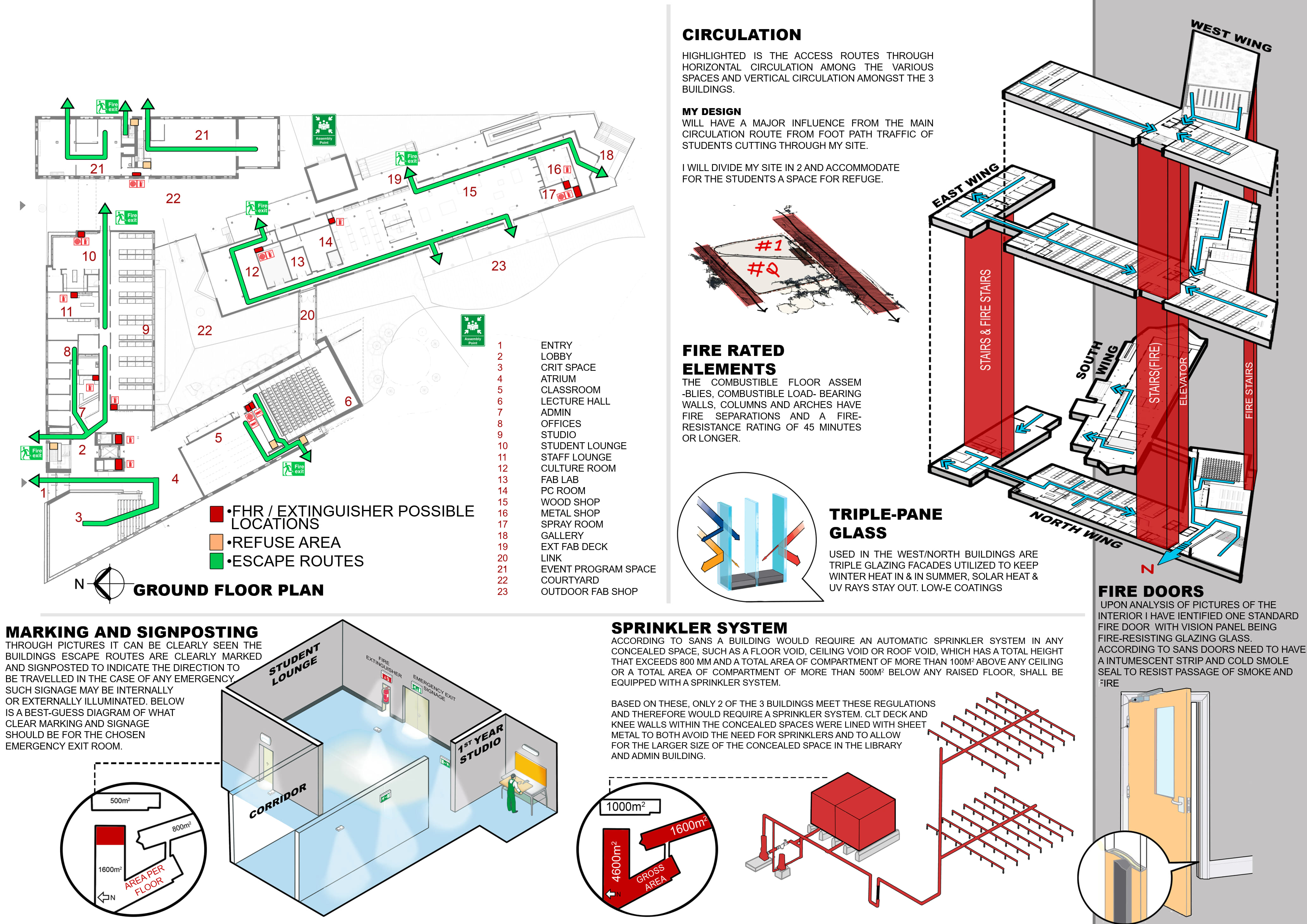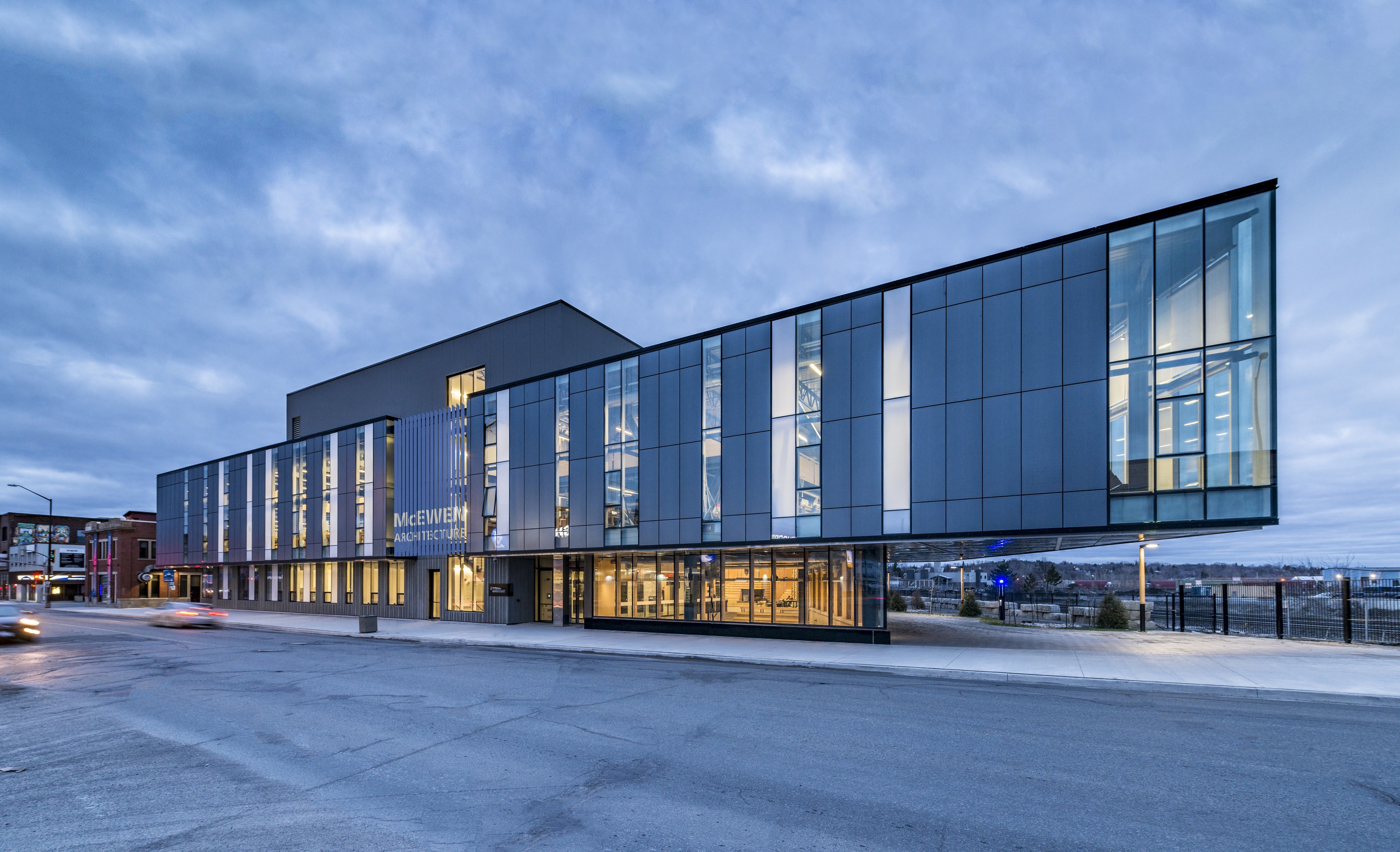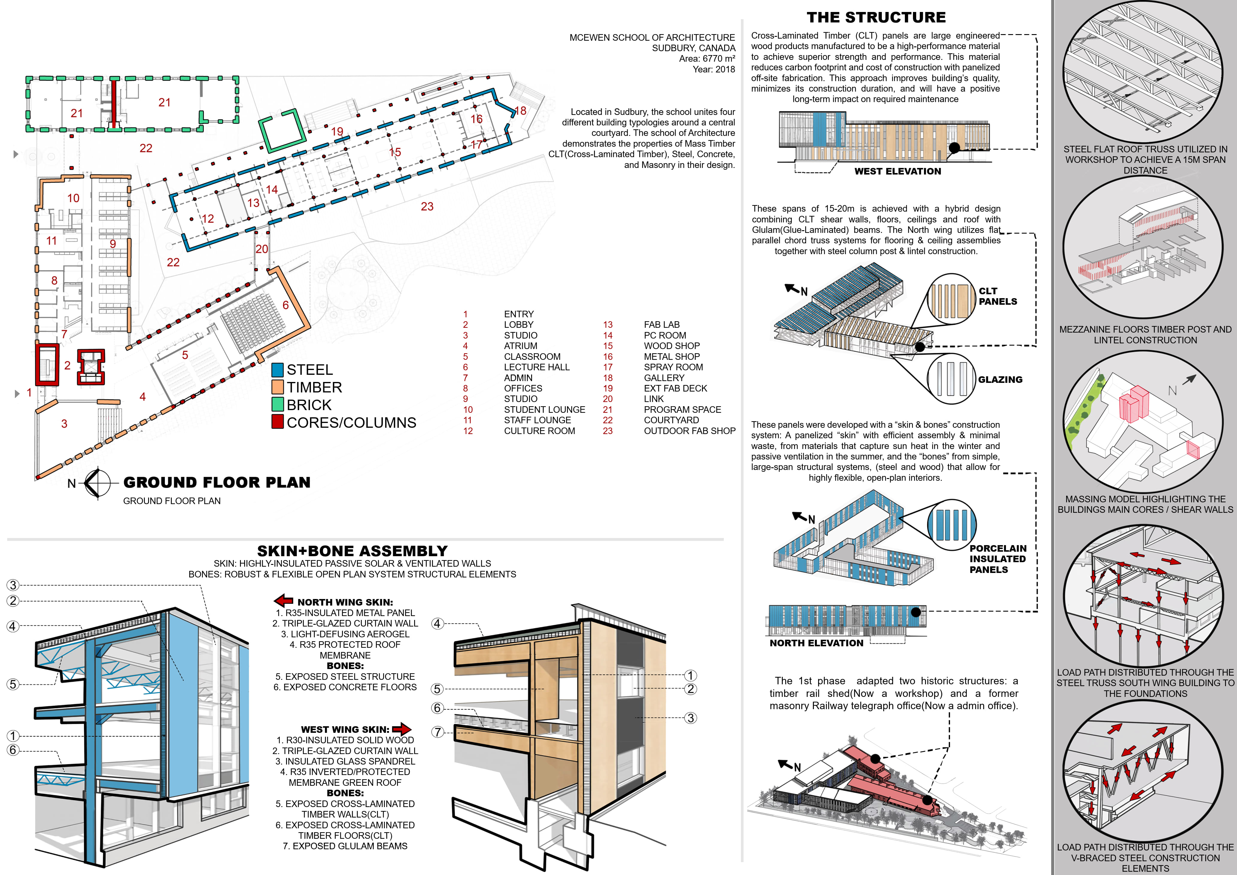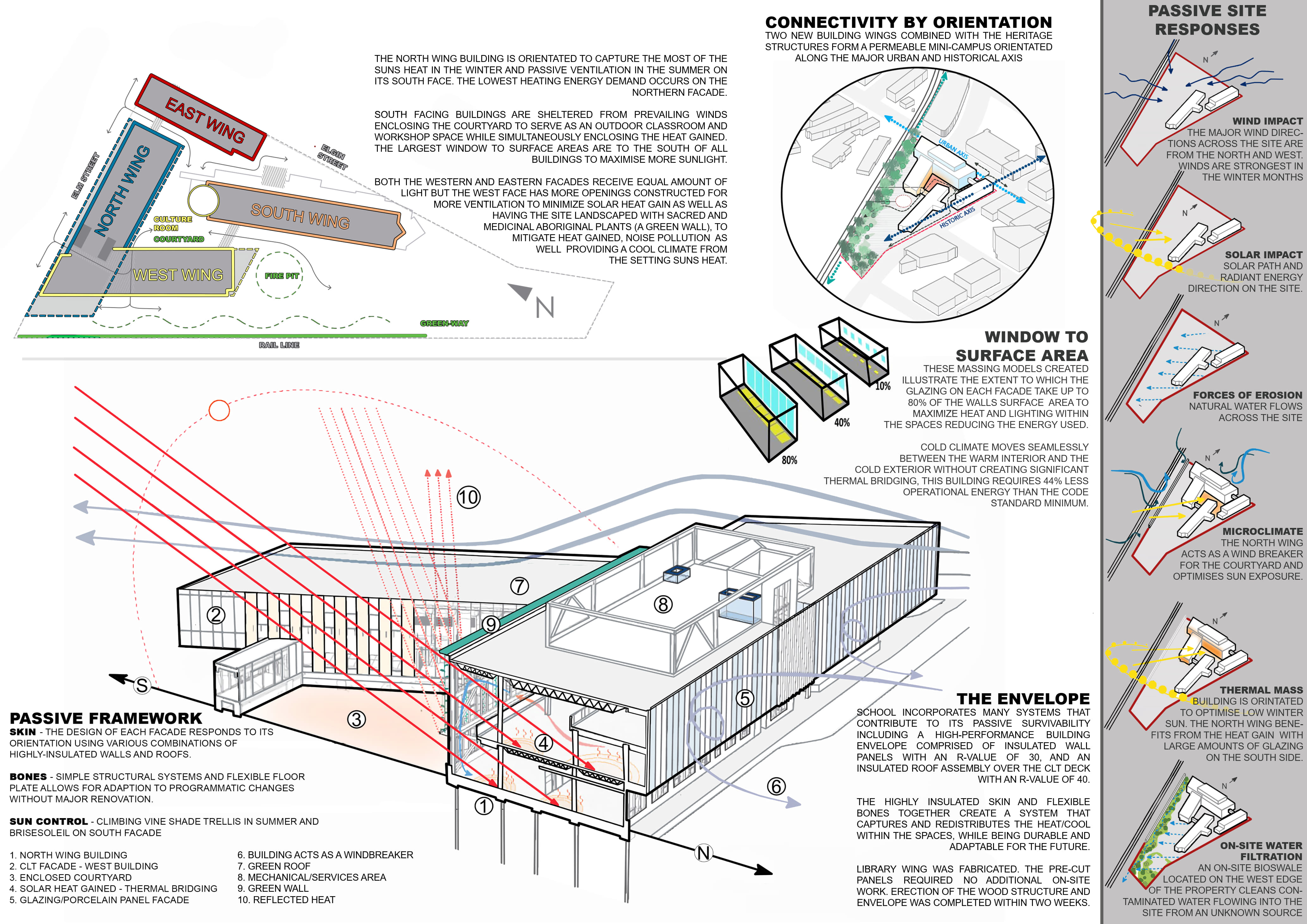This Canadian school project is conceived as a contemporary educational campus that blends material innovation, sustainable design, and hands-on learning. Organized around a central courtyard, the architecture unifies four building typologies—mass timber, steel, concrete, and masonry—into a cohesive environment that celebrates structural honesty and passive environmental performance. Two heritage structures, a timber rail shed and a historic masonry telegraph office, are thoughtfully adapted into workshop and administrative spaces, grounding the new campus in its cultural context.The design employs a hybrid “skin-and-bones” system: high-performance insulated façades form the outer skin, featuring R30–R35 wall assemblies, triple-glazed curtain walls, aerogel diffusing panels, and green roof systems. These components create a robust thermal envelope suited to Canada’s cold climate while maximizing daylight and minimizing energy consumption.