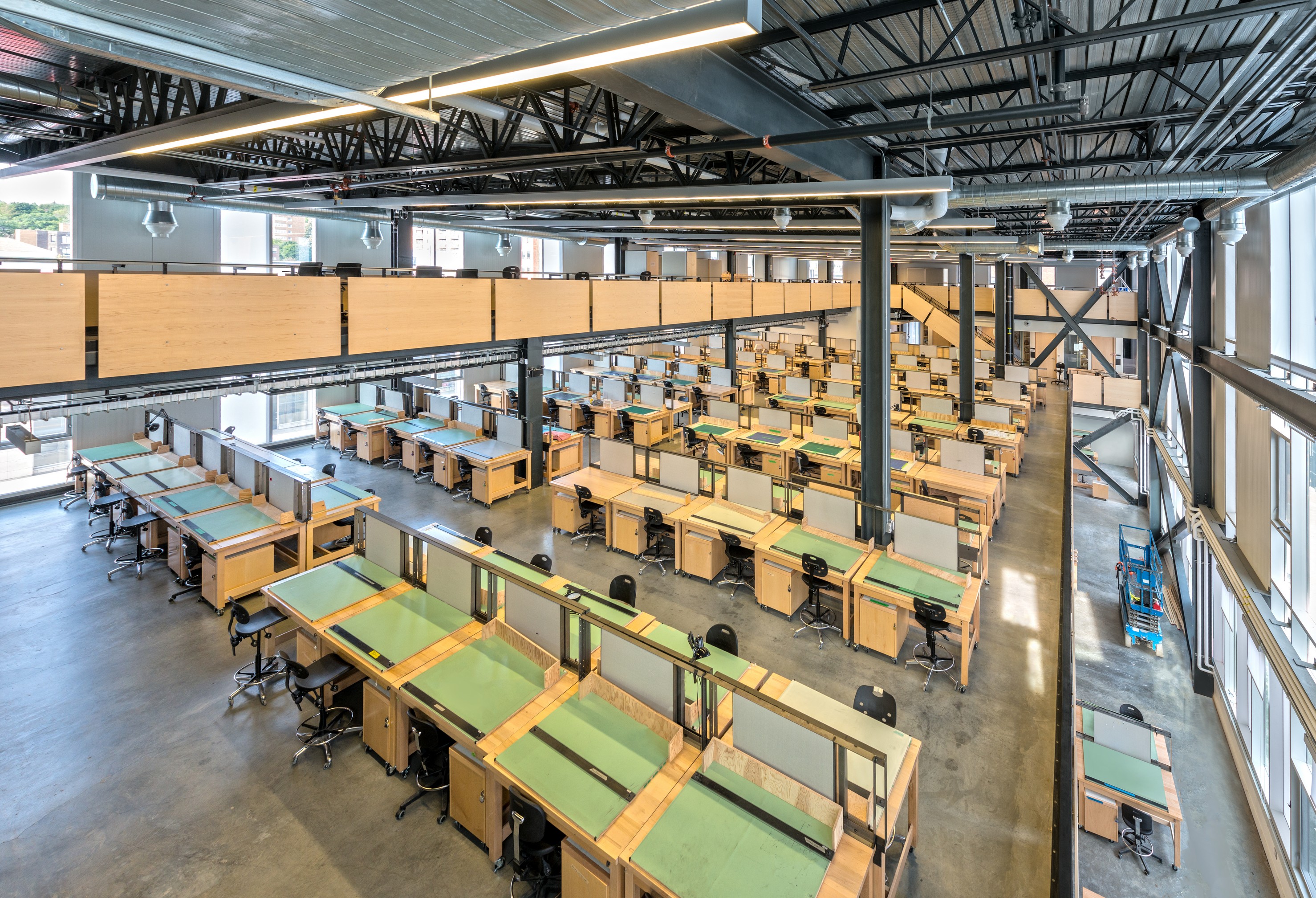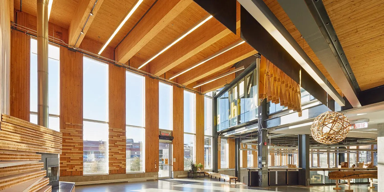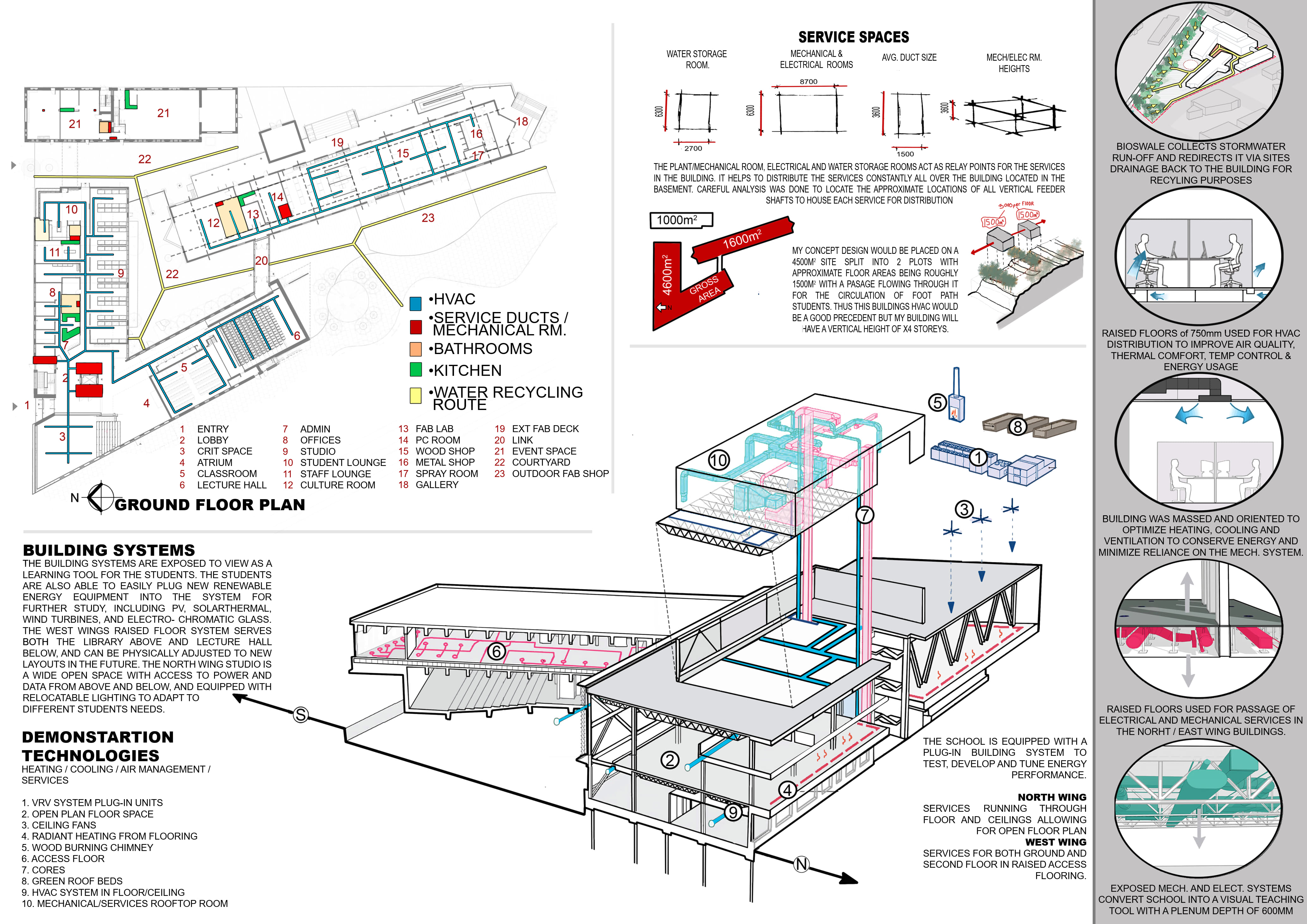 The structural “bones”—exposed CLT walls and floors, glulam beams, and large-span steel trusses—enable flexible interior layouts with spans reaching 15–20 meters, ideal for studios, workshops, and fabrication spaces.Orientation and microclimate strategies drive the project’s environmental responsiveness. South-facing facades capture winter sun, while the north wing acts as a windbreak, creating sheltered outdoor learning spaces. A landscaped western edge with indigenous plantings mitigates heat gain and enhances ventilation.Internally, exposed mechanical and electrical systems turn the school into a living educational tool. Raised access floors, adaptable service routes, and plug-in renewable energy systems allow students to study and test real building technologies.